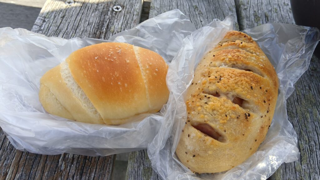 いつもの様に手賀沼の道の駅のパン屋さんでお昼を購入。今日は焼き立てのソーセージデニッシュと塩バターロールにしますた。外で食べてもポカポカ陽気で気持ち良ぃ~。