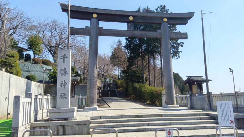 千勝神社。大きな鳥居が圧巻なのですが、今日はちょこっと中の様子を見に行くことにしますた。