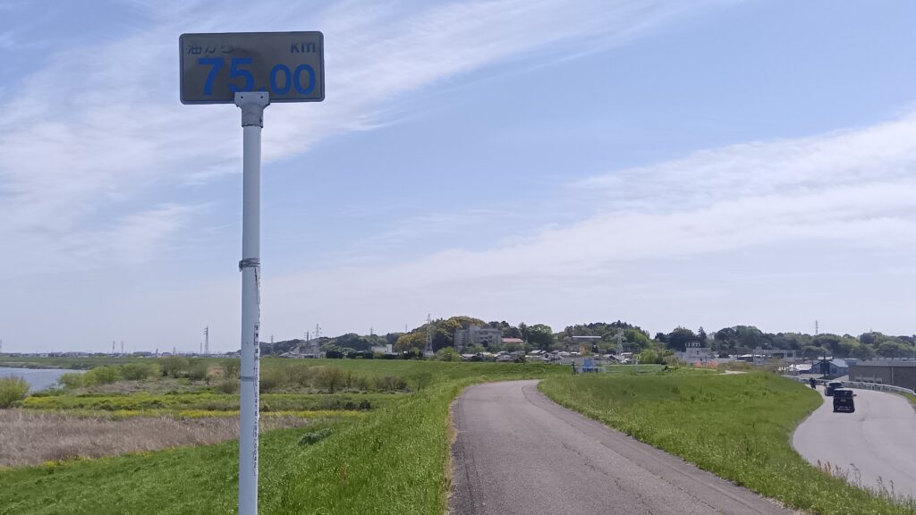 利根川へインっ。ここまでの走行距離が54kmほど。海までは75kmとのことなので、計算上は一日あれば河口までたどり着けることになりますね。ここから佐原までは40km程みたいなので、何とか行って帰ってこれそうデス。