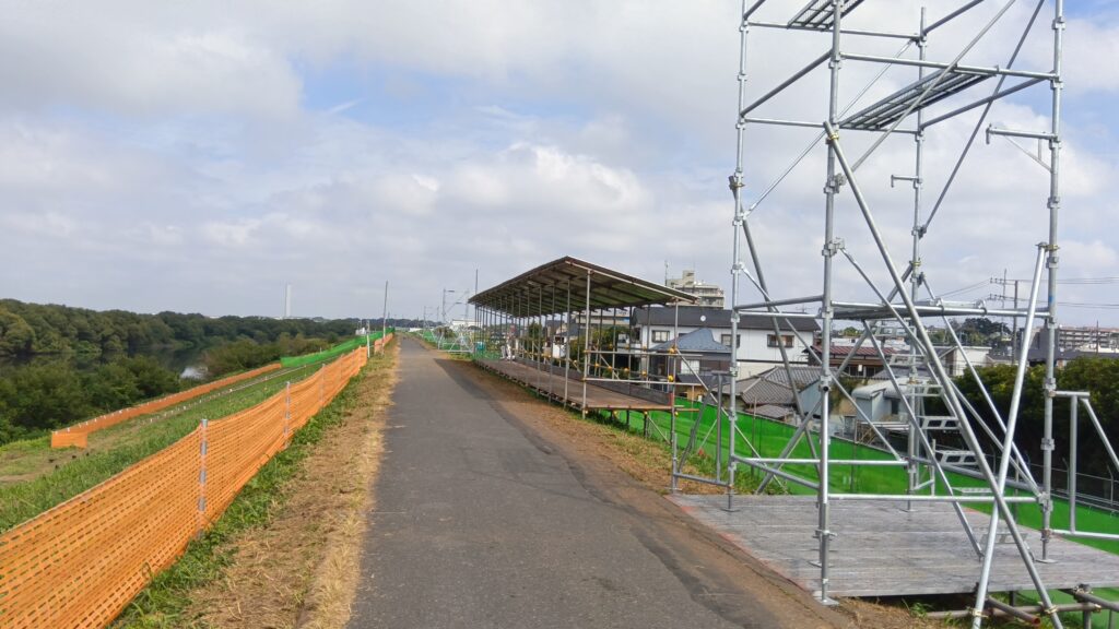 今日のロングライドの目的地は牛久沼っ。いつも水辺公園までで引き返していましたが、暑さも収まってきたので今日こそは沼を一周してやろうという計画デス。まずは手賀沼まで走るために江戸川左岸を遡っていくと、流山付近にやぐらが…他の日に右岸を走ると同じような所に何やら鉄パイプで階段らしきものを組んでいるのを見掛けていたのですが、花火大会があるのかな?と思って帰ってから調べて見ると、流山三郷花火大会が昨日開催されてたみたいですネェ。
