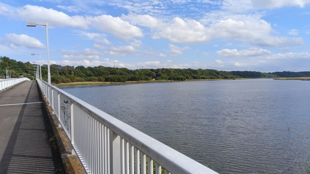 牛久沼は形がいびつなのですが、なるべく沼に沿って走ります。千勝神社は立派でしたが、それ以降の道は細い田舎道という感じ。自転車海苔には全くすれ違いませんですた。そんな道中で茎埼橋はちょっと立派な感じ。