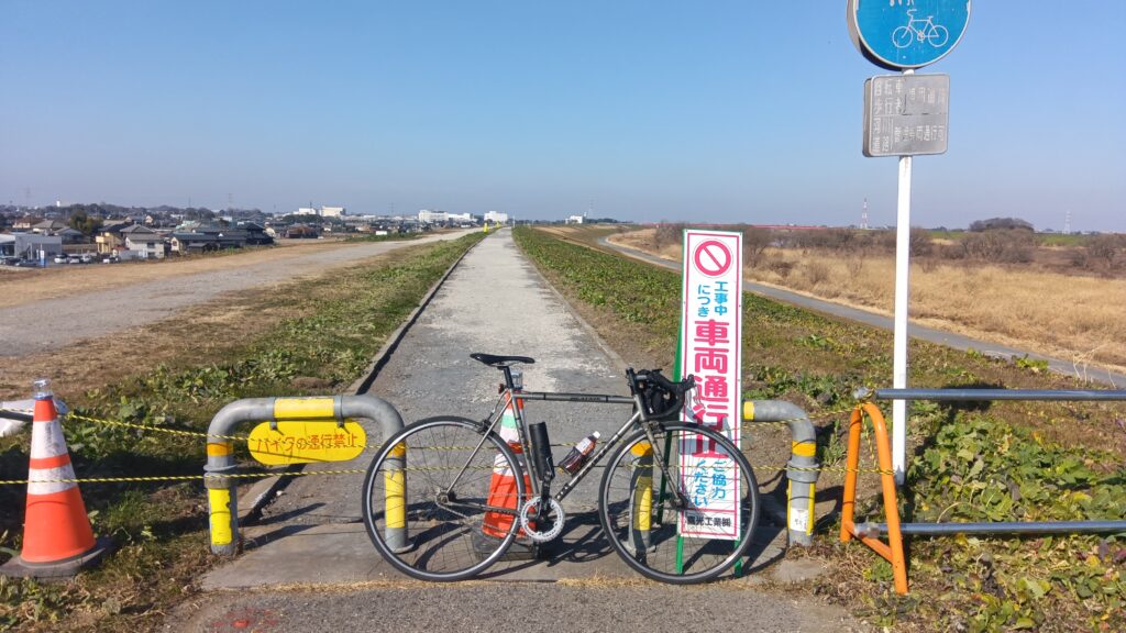 弱い向かい風基調の中を走っていくと、関宿手前の宝珠花橋~関宿橋間に工事通行止がありますた。でもこれは短い距離で、工事期間は3月末まで。