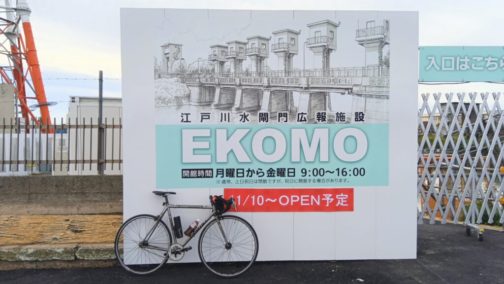 季節はすっかり秋に…今日は手賀沼→印旛沼→海の周回コースを走ることにしますた。江戸川に入ると江戸川水門に「EKOMO」とデカデカ書かれた看板が。水門ではずっと工事をしているので、これの工事か~とこの時は納得したのですが、帰ってからよくよく見ると11月10日オープンになってる…それっぽい建物は見当たりませんが大丈夫なんでしょうか?もしかして来年の11月10日開館とか? (^_^;